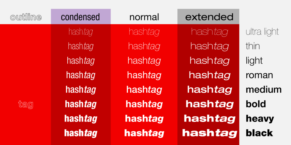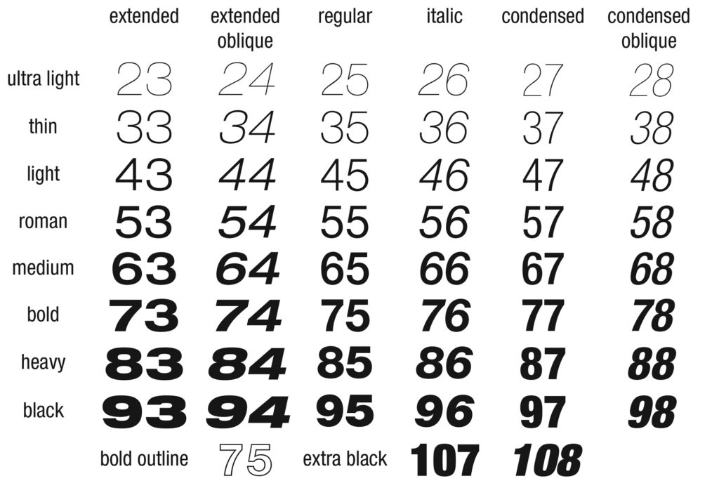 Along with the subtle improvements in clarity and consistency, one of the great things about this new ‘Neue’ family was the use of the numbering system to identify weights, widths and styles. This is the same system that Adrian Frutiger created for Univers, back when both type designs first appeared. The logic is simple: ’55’ is Helvetica Roman, the standard weight (neither bold nor light) and width (neither expanded nor condensed). The tens part of the number rises as the weight goes up: 65 for Medium, 75 for Bold, 85 for Black, and 95 for the ultimate Extra Black. At the other end of the scale, 25 is Ultra Light. The ‘ones’ part of the number handles two things: width (3 is wider than 5, 7 is more condensed) and style (odd numbers are upright, even numbers are italic).